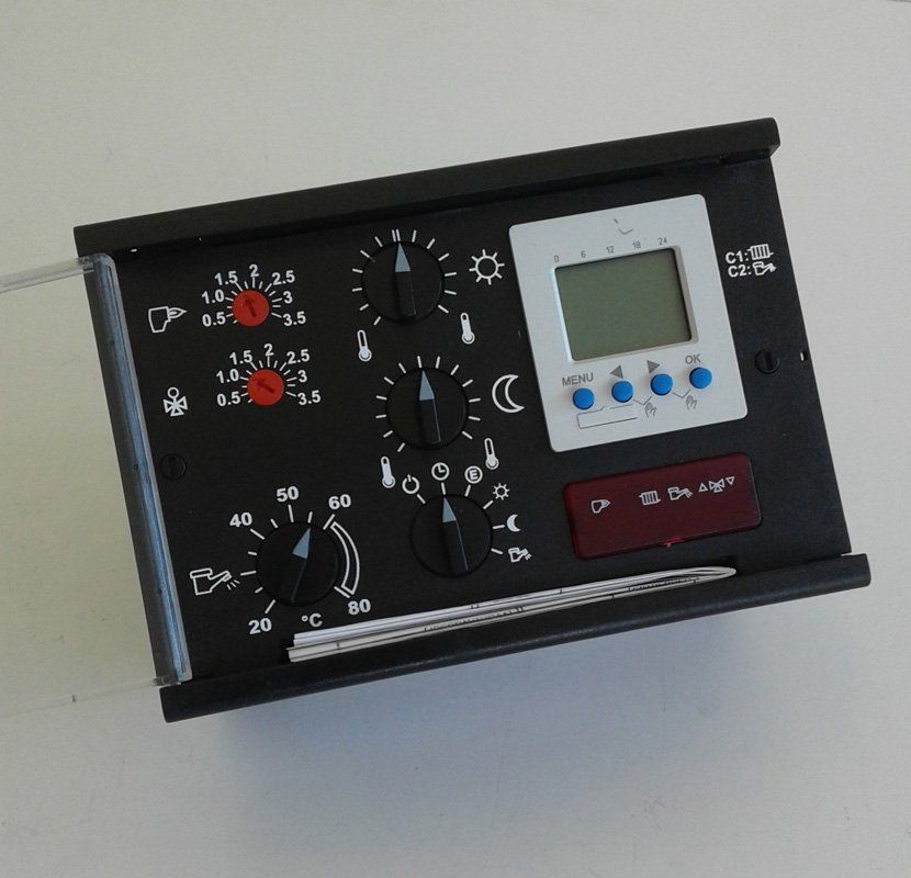 - Elektronische Speichertemperaturregelung, Speichervorrangschaltung, Ladepumpennachlauf, Betriebswahlschalter, Kesselanfahrschutz
